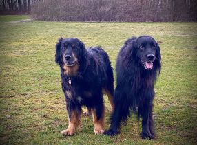 Dann kam der Sonntag, das war gestern, da fuhr doch tatsächlich Bahrams Familie auch aus NRW über Riesenumwege an den zerstörten Autobahnen vorbei zu uns um sich ihren Kronprinzen abzuholen. Bahram durfte zu seinem Papa. Er soll einmal, wenn alles gut geht in dessen große Fußstapfen treten und ein Deckrüde werden und Gavins und Jettes Gene an weitere Generationen weiter geben. Das ist schon eine schöne Aussicht. Am schönsten aber ist, dass Bahram ein heiß ersehntes und heiß geliebtes Geburtstagsgeschenk für sein Fraule sein wird. Morgen sitzt er auf der Geburtstagstorte. Machs gut Bahram, ch gebe dir alle meine guten Wünsche mit auf den Weg. Werde vor allem ein glücklicher großer Hovawart.